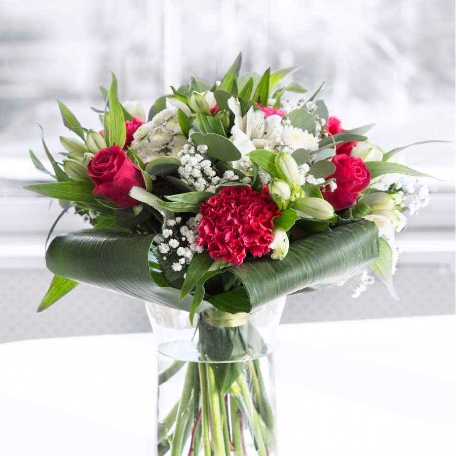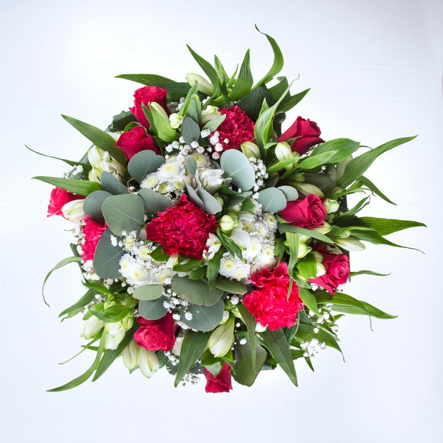 Celebrate Elegance with our striking flower arrangement, designed to inspire and delight. This breathtaking bouquet combines white chrysanthemums, vivid red roses, delicate gypsophila, bright carnations, and elegant white alstroemeria, all thoughtfully arranged with aspidistra leaves.
